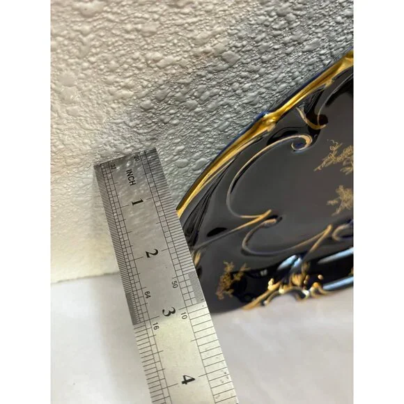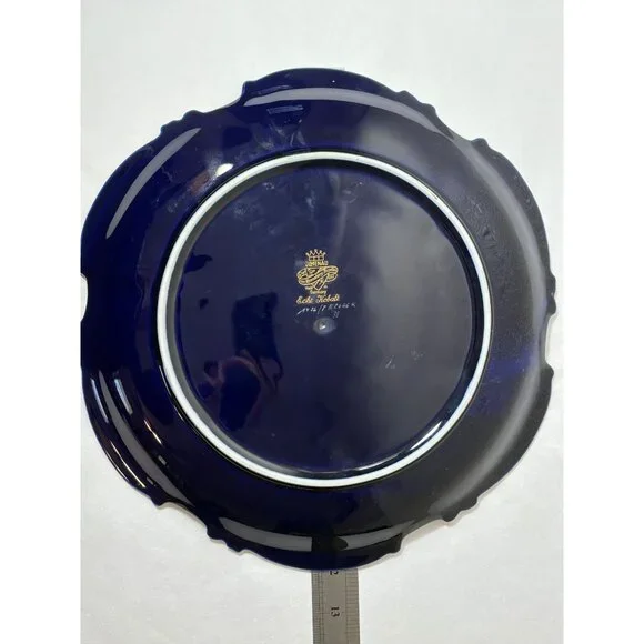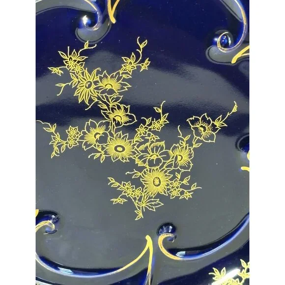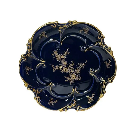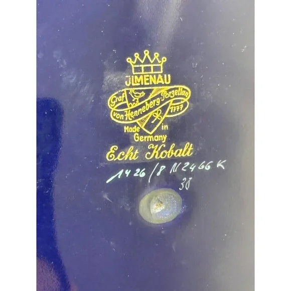 Jlmenaü Graf Von Henneberg Echt Kobalt Porzellan 12" Gold Floral Plate Germany• Beautiful floral design• Made in Germany• Echt Kobalt finish• Intricate detailing• Decorative collectible pieceDiameter = 12 inches In excellent vintage condition, no chips or cracks, minimal gold loss from age and use, see images.